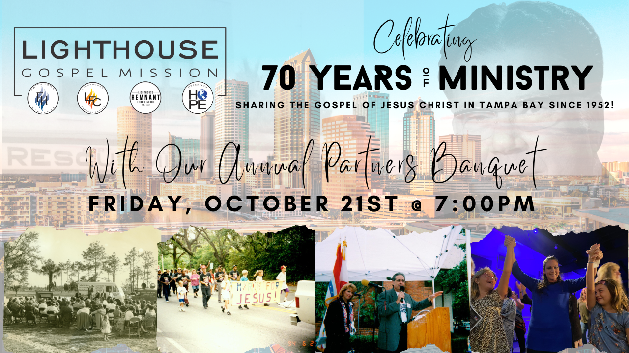 This year, we are celebrating 70 years of ministry…70 years of serving the Tampa Bay Community! I am grateful and excited to report that the vision of the Lighthouse Gospel Mission, which started in 1952 with our founder, Reverend J.A. Lennard, is still going stronger than ever. We are seeing men and women from all over the United States come and be set free through a relationship with Jesus and being discipled in the Word of God. It’s amazing to hear their stories of victory and freedom amidst the circumstances of addiction, bondage, and brokenness that led them to the Lighthouse.