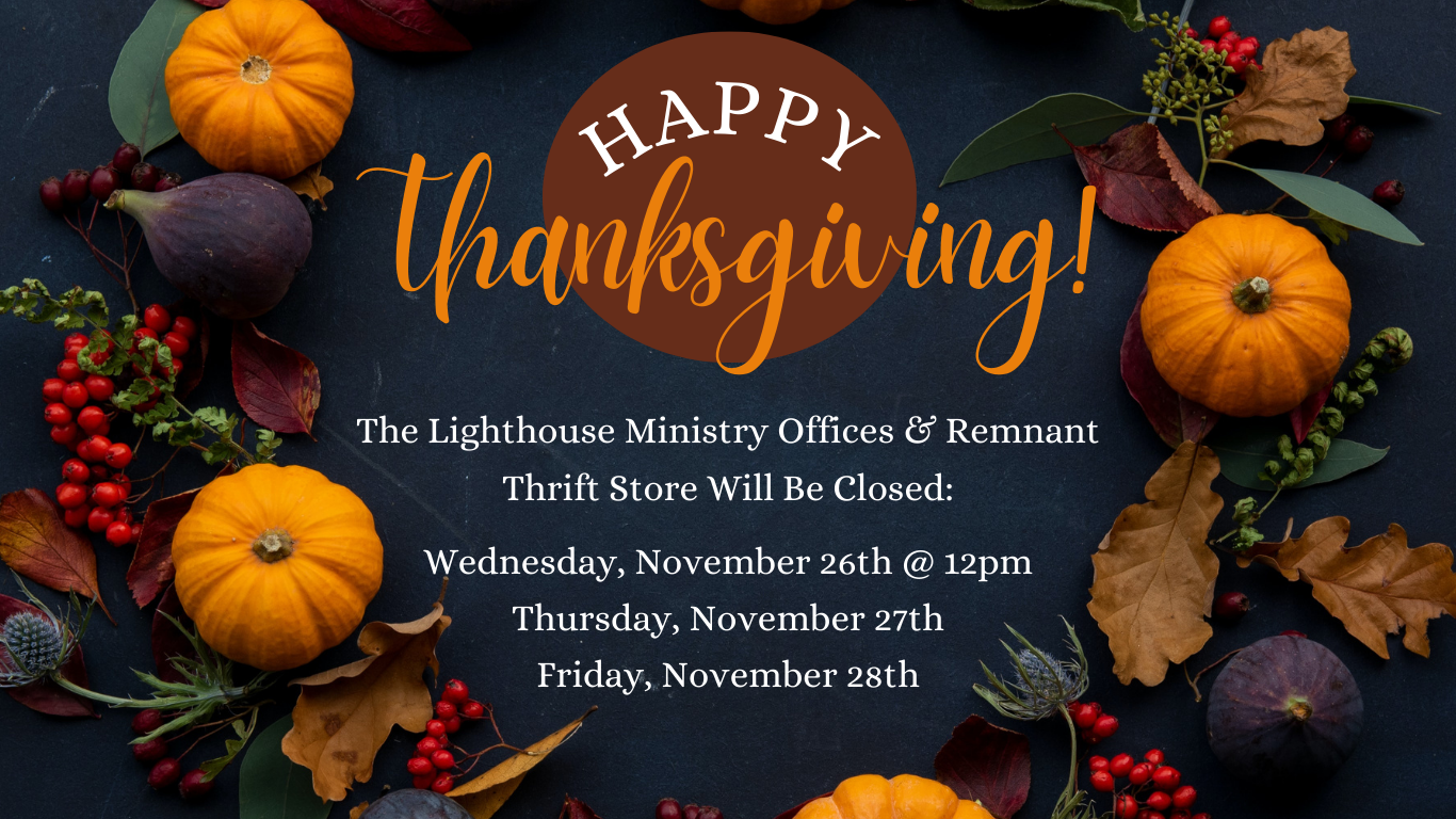 The Ministry, as well as the Remnant Thrift Store, will be closed for Thanksgiving break. We will reopen on Saturday morning, November 29th.